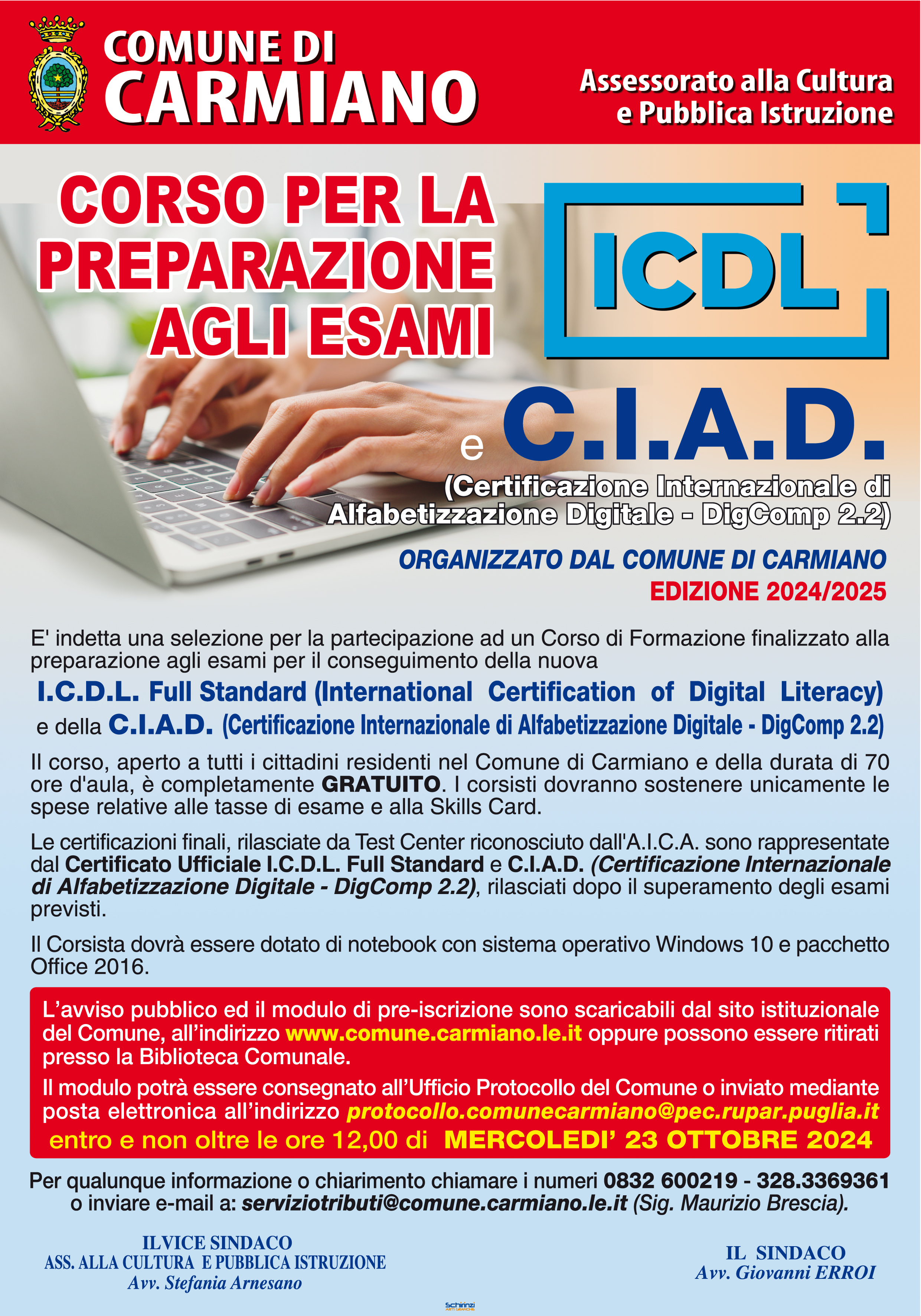 Il corso, aperto a tutti i cittadini residenti nel Comune di Carmiano e della durata di 70 ore d’aula, è completamente gratuito. I corsisti dovranno sostenere unicamente le spese relative alle tasse di esame e alla Skills Card.