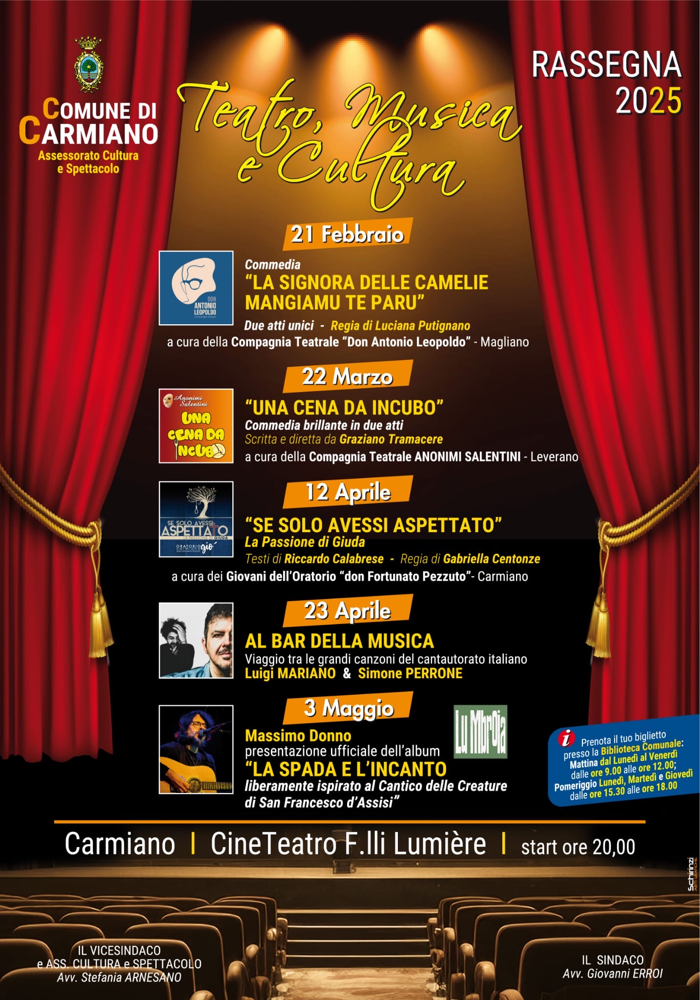 Anche per l'annualità 2025, l'Amministrazione Comunale, per il tramite dell'Assessorato alla Cultura e Spettacolo, ha organizzato una rassegna teatrale, promuovendo una pluralità di eventi ed iniziative di vario tipo e genere. Il prossimo appuntamento vedrà in scena, sabato 22 marzo, la Compagnia Teatrale "Anonimi Salentini" con una commedia brillante in due atti dal titolo "Una cena da incubo", presso il Cineteatro "Lumière". Vista la grande partecipazione, è necessario prenotare il proprio ticket d'ingresso presso la Biblioteca Comunale.