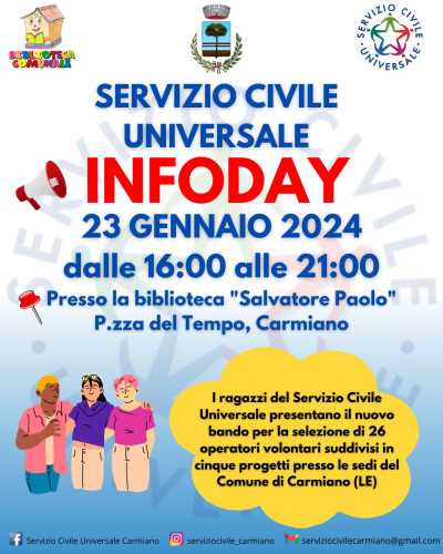 Gli operatori volontari del Servizio Civile Universale operanti presso le sedi del Comune di Carmiano presentano il nuovo bando emanato dal Dipartimento per le Politiche Giovanili ed il Sevizio Civile Universale per la selezione di n. 52.236 operatori volontari da impiegare in progetti afferenti a programmi di intervento da realizzarsi in Italia e all’estero.